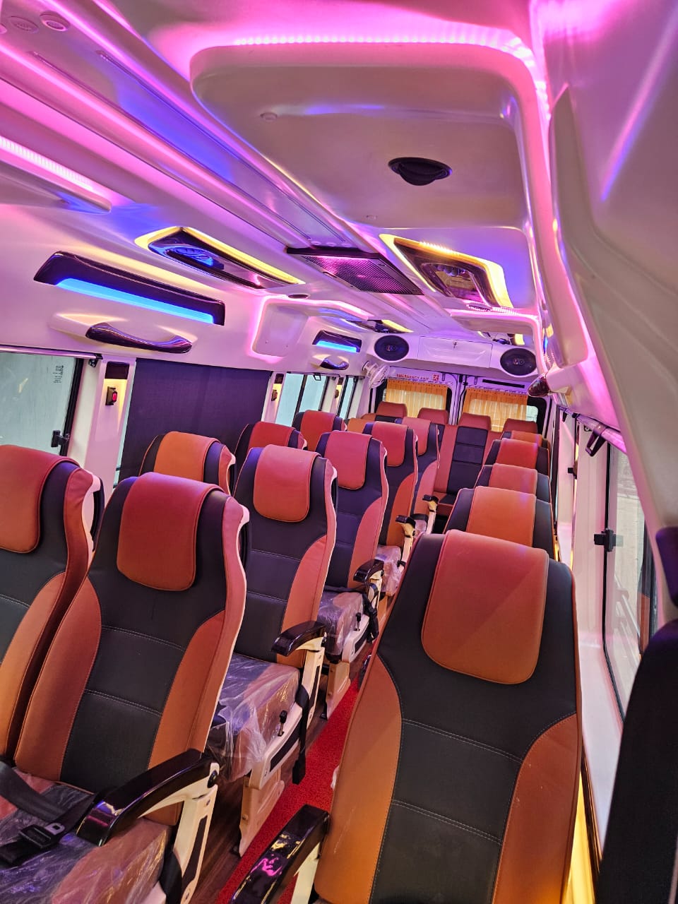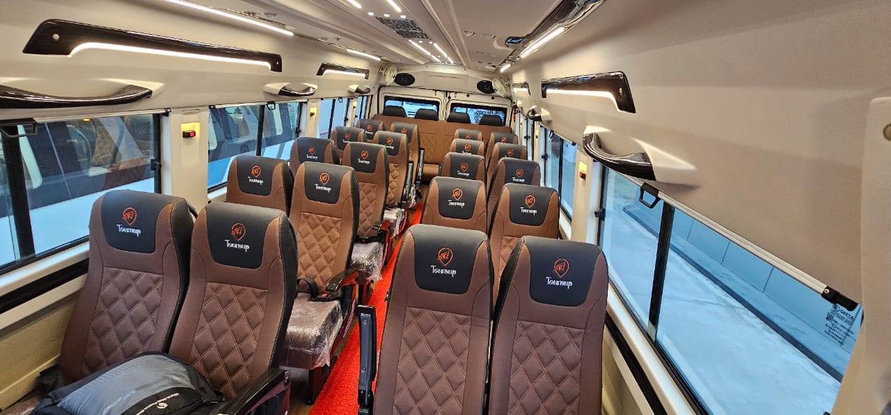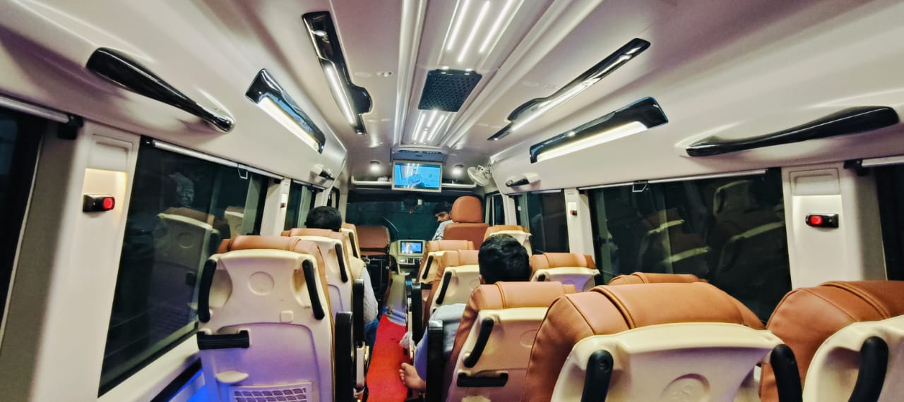 You can choose from our range of Tempo Travellers that fit 13, 17, 20, or 26 passengers. The 13-seater is ideal for smaller groups, while the 17-seater offers extra headroom for comfort. For larger groups, the 20 and 26-seater options provide plenty of space and come with features like TVs and music systems to keep everyone entertained during the ride.